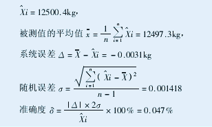 數據統計誤差通常分隨機誤差和系統誤差。隨機誤差是在實(shí)際測量條件下多次測量同一量值時(shí),誤差的絕對值和符號以不同方式變化著(zhù)的誤差。它反映了被測檢驗裝置的精度,隨機誤差越小,說(shuō)明其精度越高。系統誤差是在偏離規定的測量條件下多次測量同一量值時(shí),誤差的絕對值和符號保持恒定的誤差。系統誤差反映了被測檢驗裝置的正確度,系統誤差越小,說(shuō)明其正確度越高。評價(jià)檢驗裝置的精度既不能單獨看其隨機誤差,也不能單獨考查其系統誤差,而是要對其進(jìn)行綜合分析和計算,從而確定被測檢驗裝置的綜合指標,即準確度(此時(shí)不討論誤差分配問(wèn)題)。2003年8月23日在現場(chǎng)測試循環(huán)鏈碼稱(chēng)量數據10次:12496 12497 12498 12495 12499 12496 12497 12499 12497 12499,通過(guò)對循環(huán)鏈碼總重量計算值為